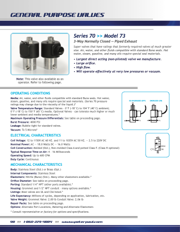 Media: Air, water, and other fluids compatible with standard Buna seals. Hot water, steam, gasoline, and many oils require special seal materials. (Series 70 pressure ratings may change due to the viscosity of the liquid.)*