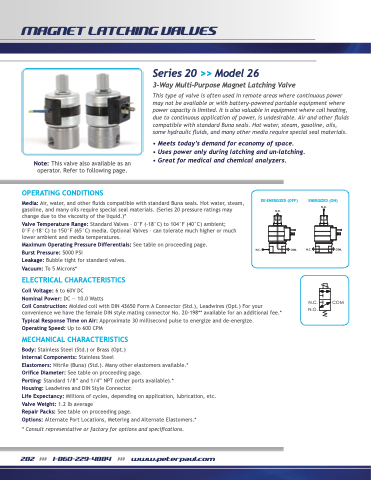 This type of valve is often used in remote areas where continuous power may not be available or with battery-powered portable equipment where power capacity is limited. It is also valuable in equipment where coil heating, due to continuous application of power, is undesirable. Air and other fluids compatible with standard Buna seals. Hot water, steam, gasoline, oils, some hydraulic fluids, and many other media require special seal materials.